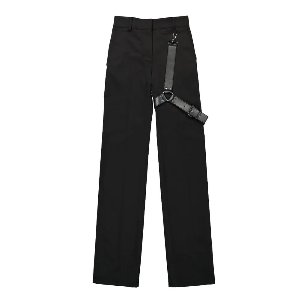Black wide-leg trousers featuring a high-waisted fit and a detachable harness detail with a buckle closure on the left hip. The trousers have a clean front with no visible pockets and a zip fly with a button closure.