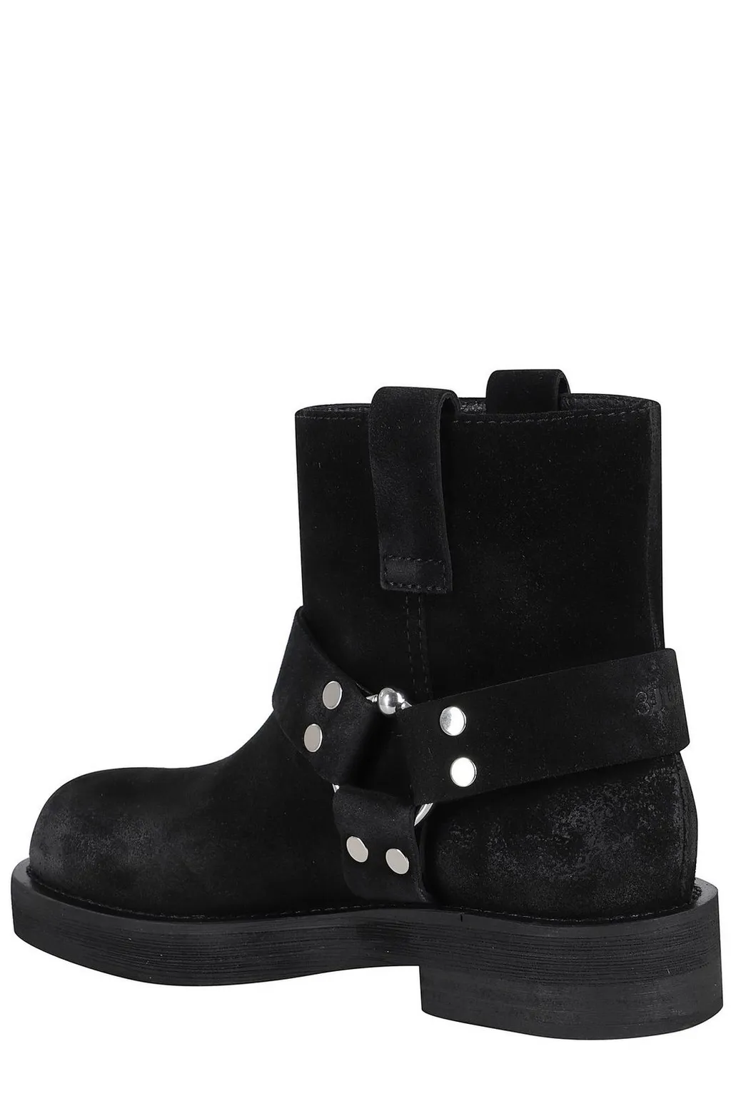 Black suede ankle boots with a round toe, a side buckle strap with d-ring detail, and a pull-tab at the back. The boots have a chunky platform sole.