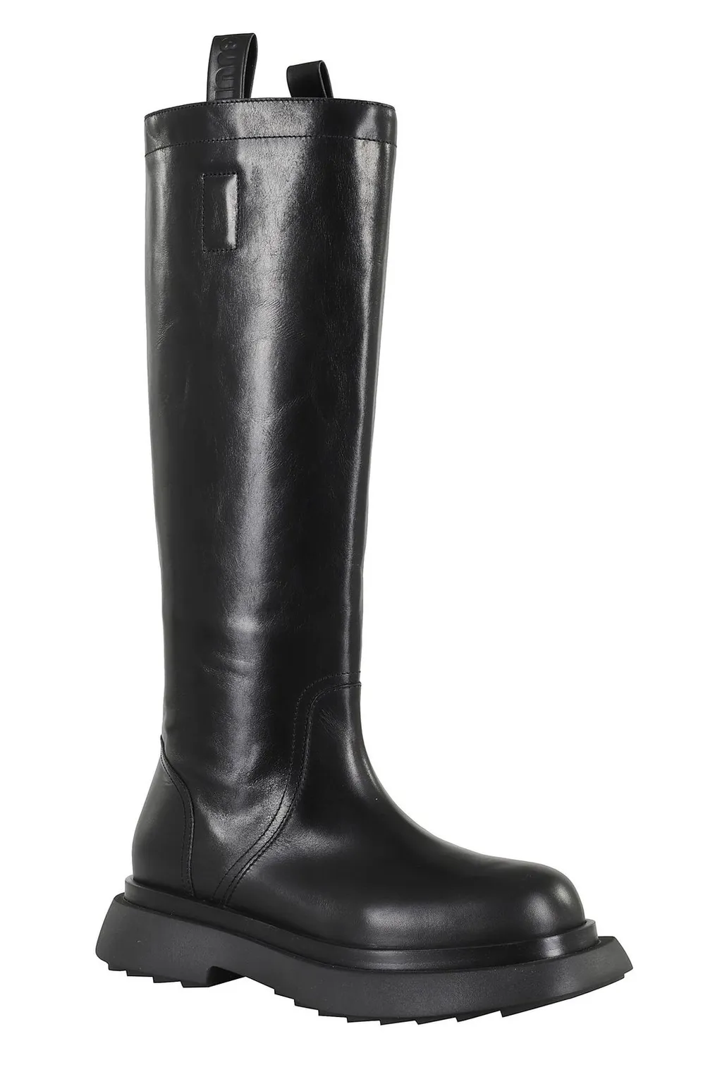 Knee-high boots with a round toe and a chunky platform sole. The boots feature a pull-on design with loop tabs at the top shaft. The shaft is smooth and unadorned, reaching up to the knee.