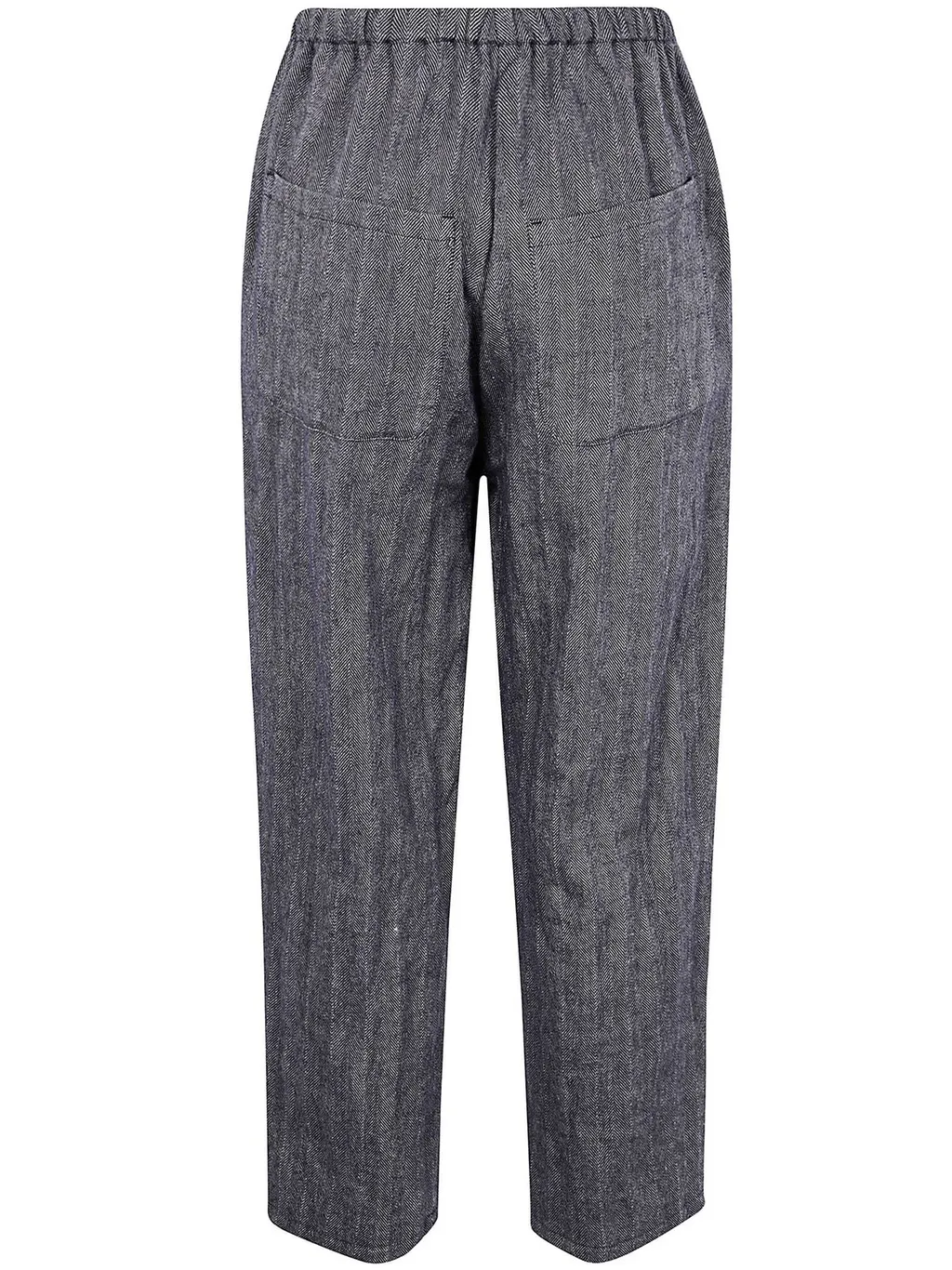 These pants feature an elastic waistband and a relaxed fit. They have a subtle herringbone pattern and two back pockets.