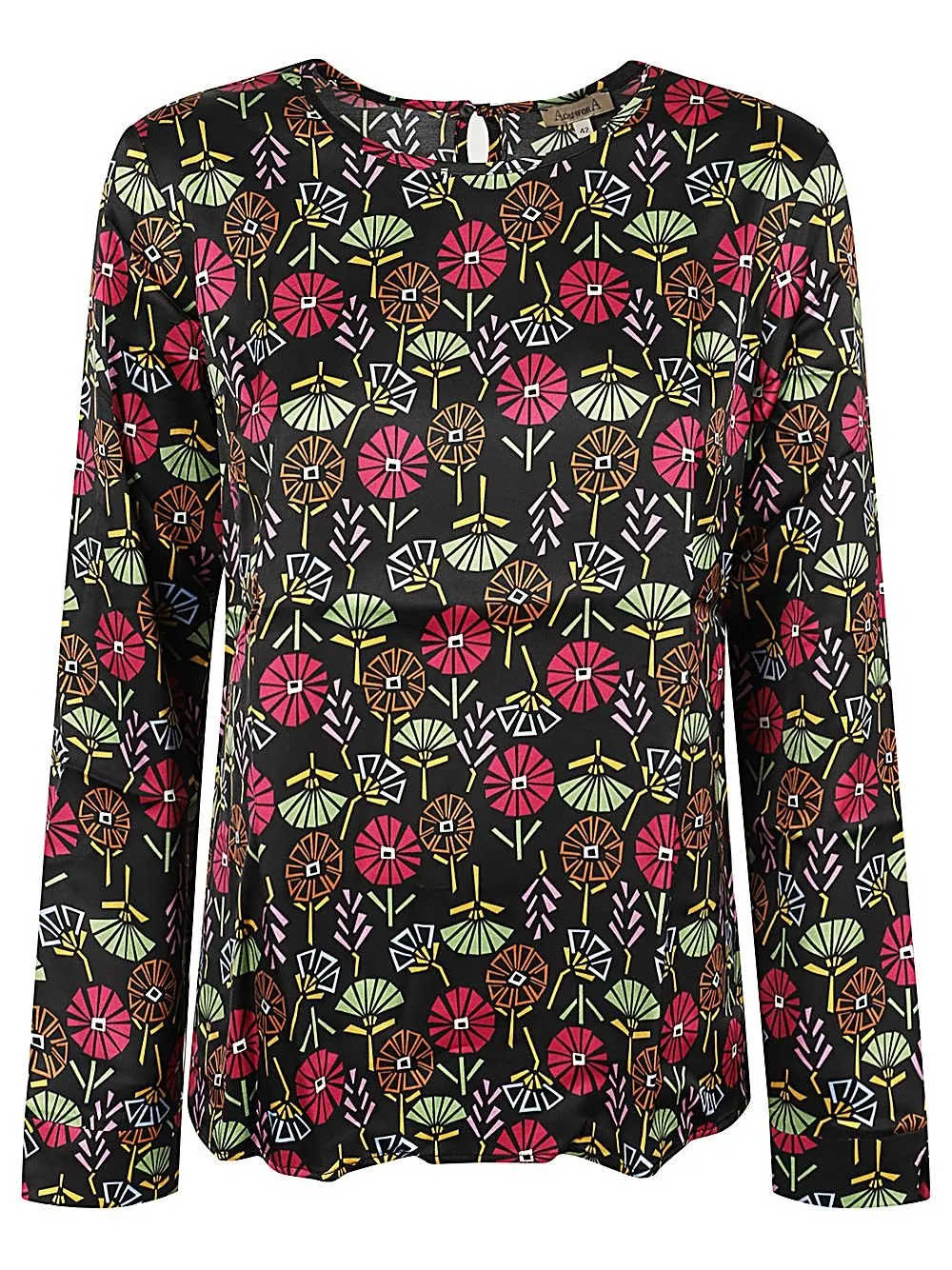 DescriptionA long-sleeved black top with a repeating floral print. The print features stylized flowers in shades of pink, red, yellow, and green, with thin black outlines. The top has a round neckline with a small keyhole opening at the back, secured by a button. The sleeves are full length and the hemline is straight.