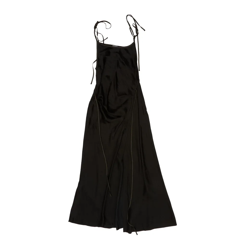 DescriptionA black maxi slip dress with thin adjustable spaghetti straps. The dress features a subtle sheen and a thigh-high slit on the left side, with a zipper closure along the slit. The silhouette is a classic slip style, falling straight to the floor.