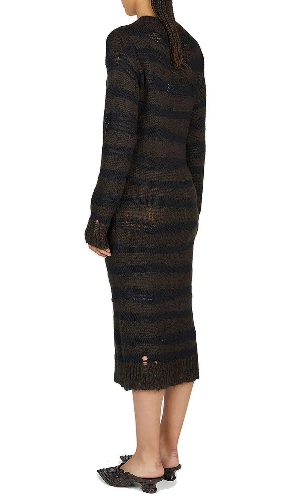 DescriptionA long-sleeved, crew neck, midi-length knit dress with a horizontal striped pattern. The dress features a distressed, open-knit construction with visible holes and frayed edges, particularly at the hem and cuffs. The silhouette is form-fitting.