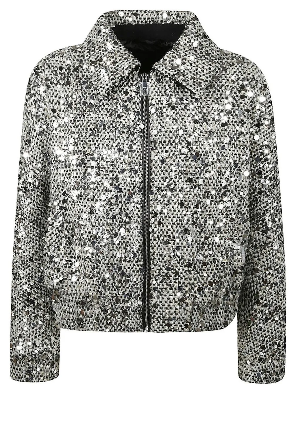 This is a cropped jacket with a collar and a zip closure. It features a sequined tweed fabric. The sleeves are long and the hem is straight.