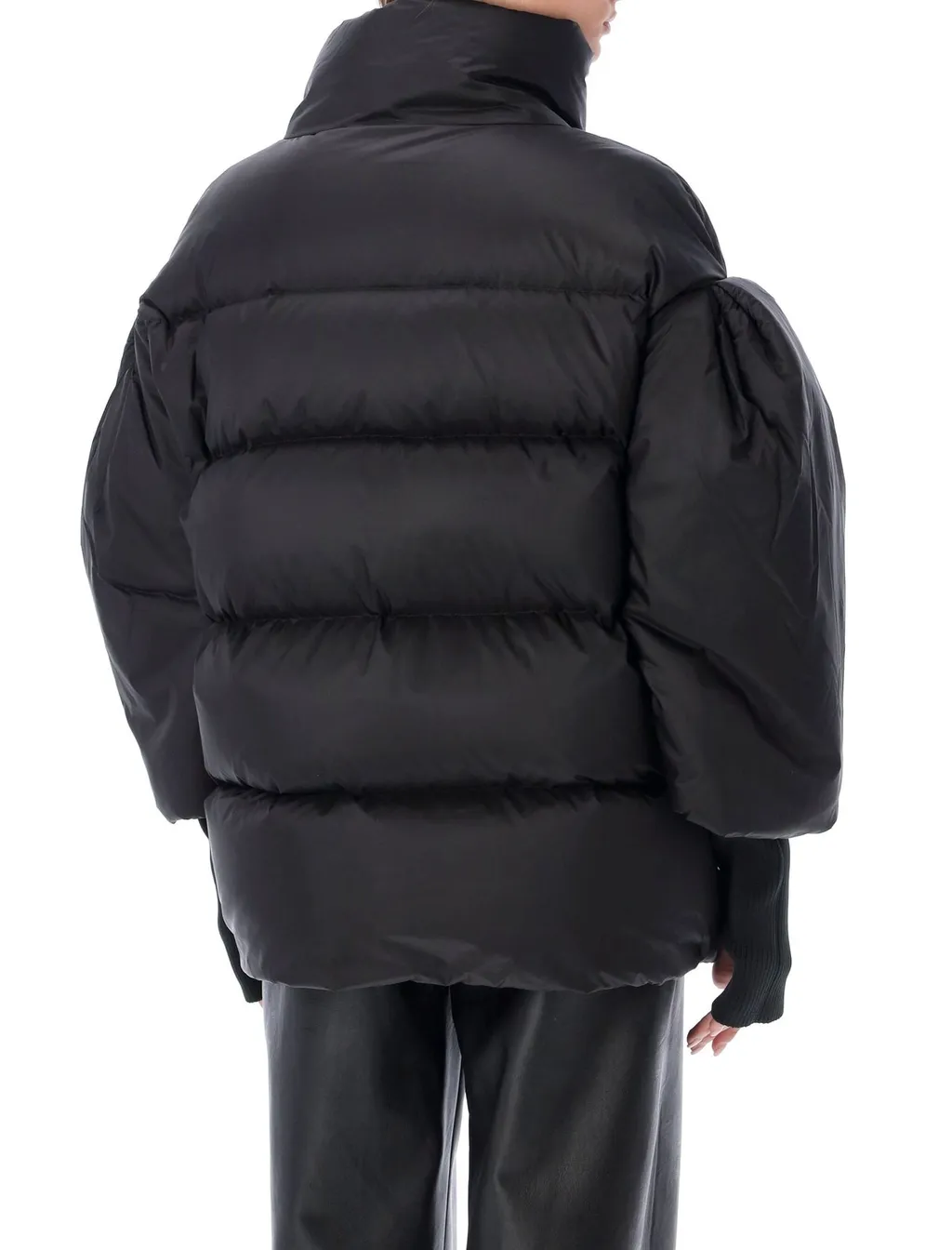 A black puffer jacket featuring a high neck, a central zipper closure, and voluminous, gathered sleeves that taper to ribbed cuffs. The jacket has a quilted design and a relaxed, oversized fit.