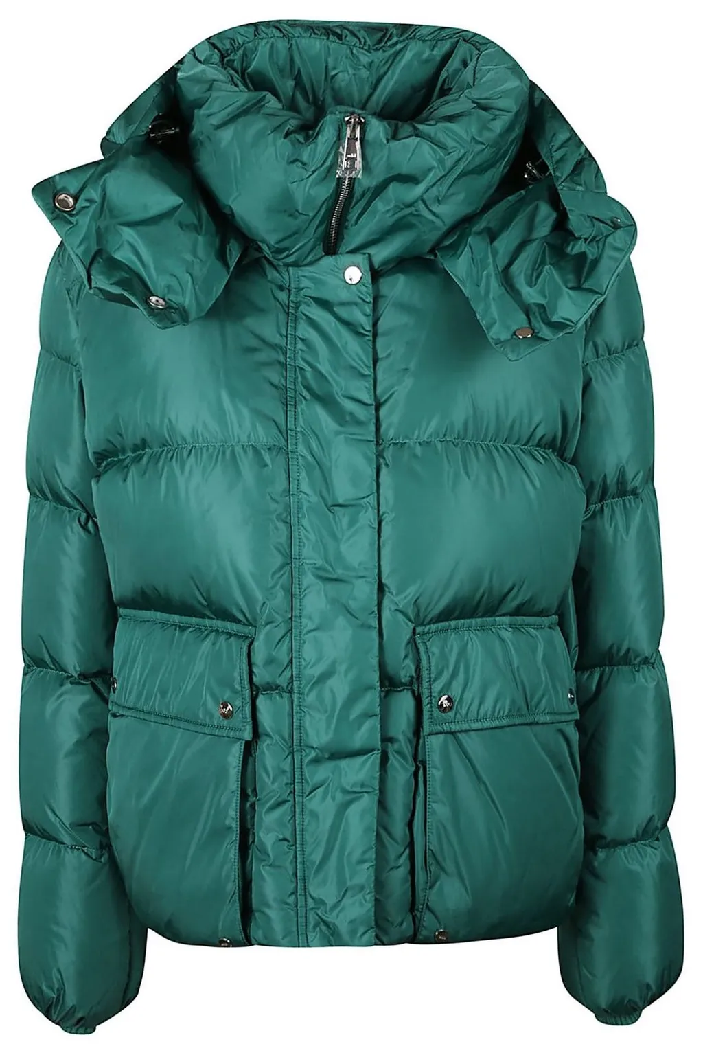 A green puffer jacket with a high collar and attached hood. It features a zip closure, two flap pockets with snap button closures on the front, and a quilted design. The jacket has a relaxed fit and is suitable for colder weather.