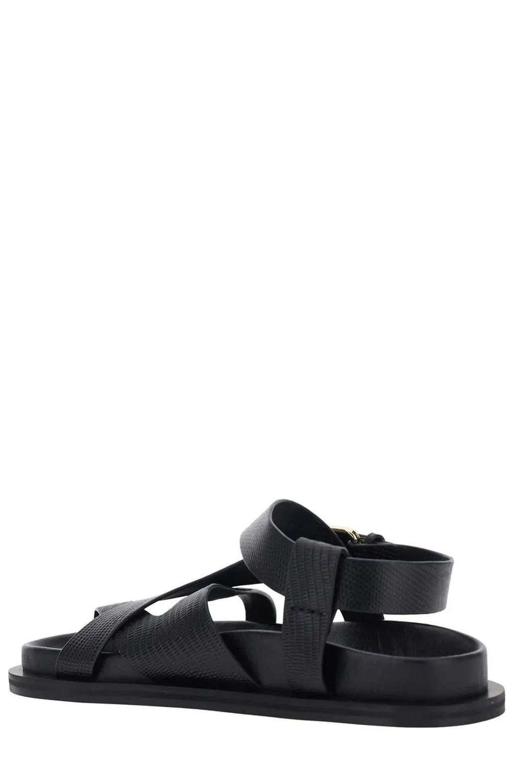 Black leather sandals with a flat sole and a buckle closure. The sandals feature multiple straps across the foot and an ankle strap.