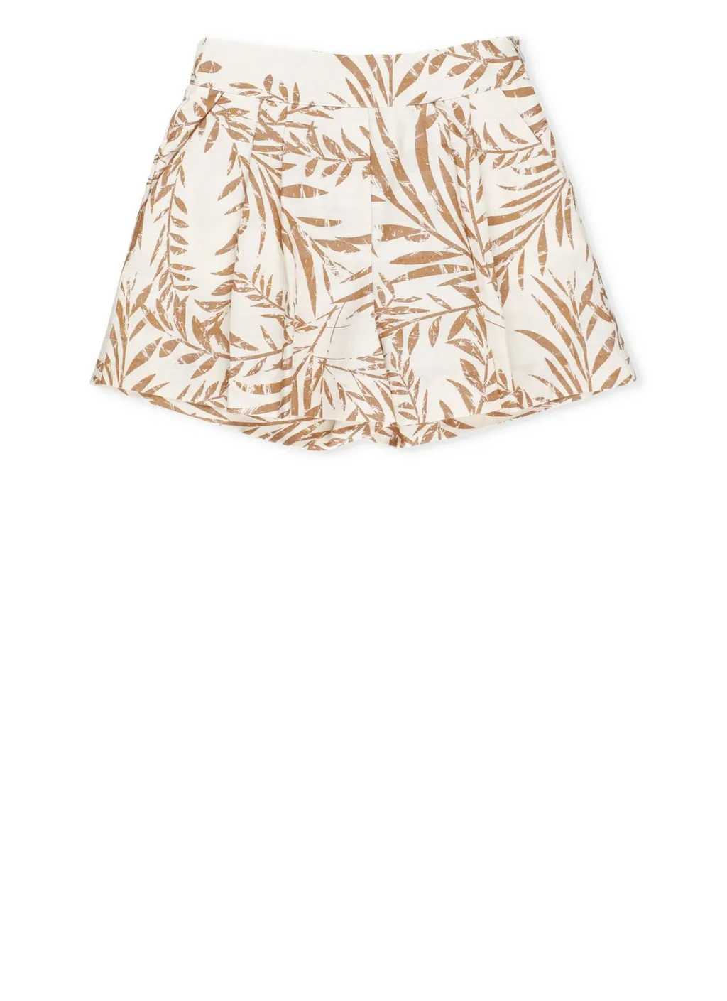 High-waisted shorts with a relaxed fit. Features a concealed side zipper closure and side pockets. The shorts have a pleated front and a wide hem. The fabric is printed with a tropical leaf motif.