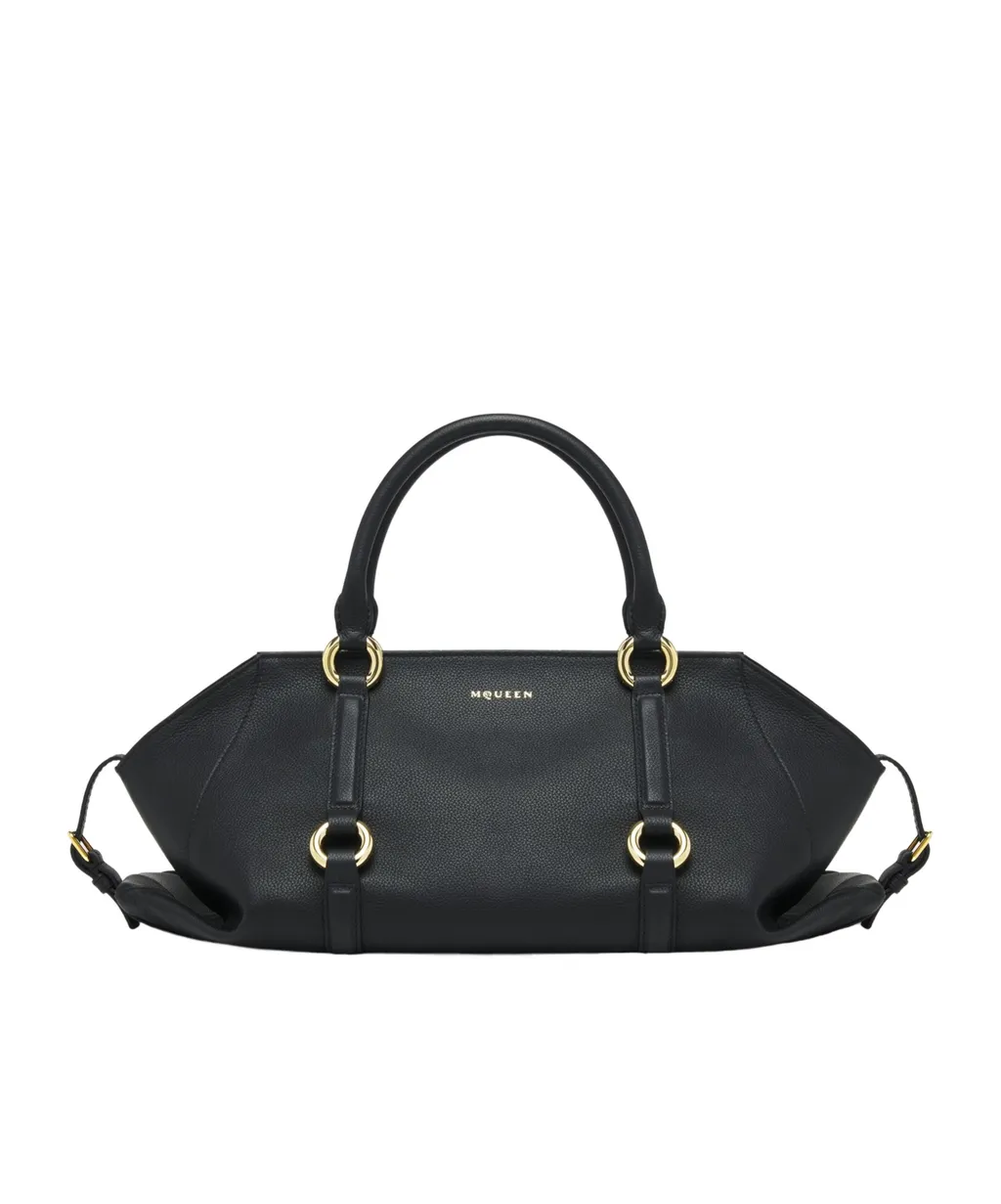 The tote bag features adjustable side edges, mcqueen logo, a zippered main pocket, leather sandwich, and gold rings.