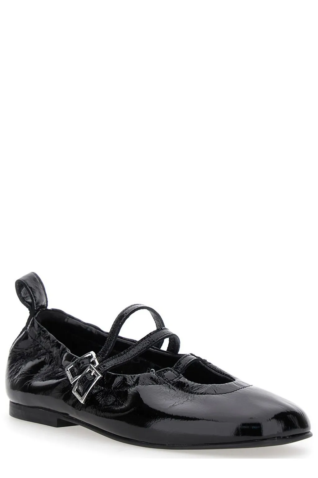 Black patent leather ballet flats with a square toe. Features a gathered effect at the vamp and adjustable ankle straps with a buckle closure. Includes a pull tab at the heel.
