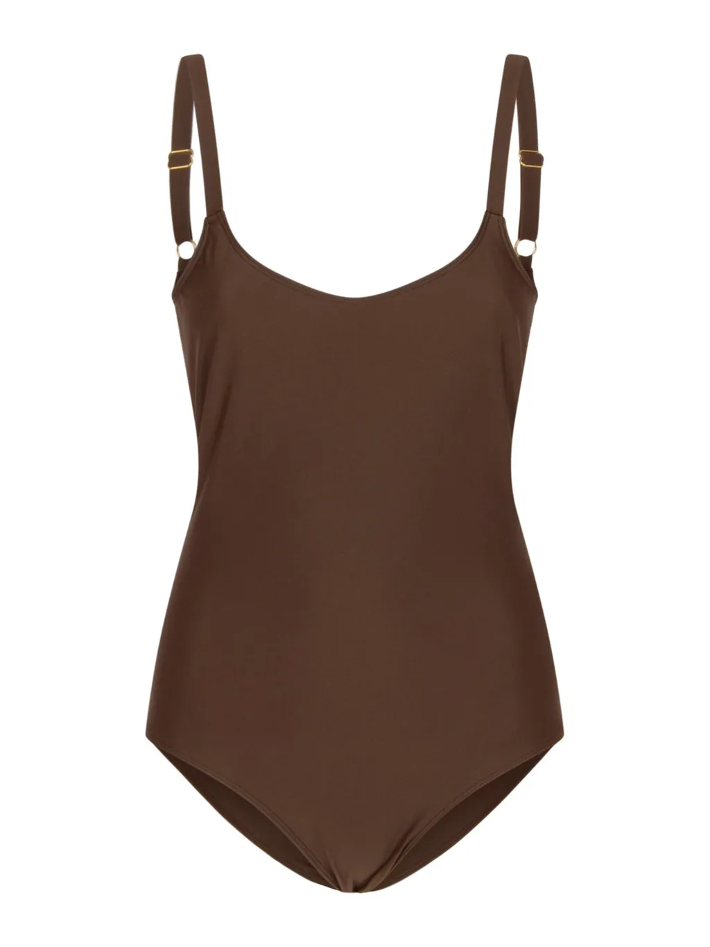 A simple, solid brown one-piece swimsuit with adjustable shoulder straps and a low scoop back.