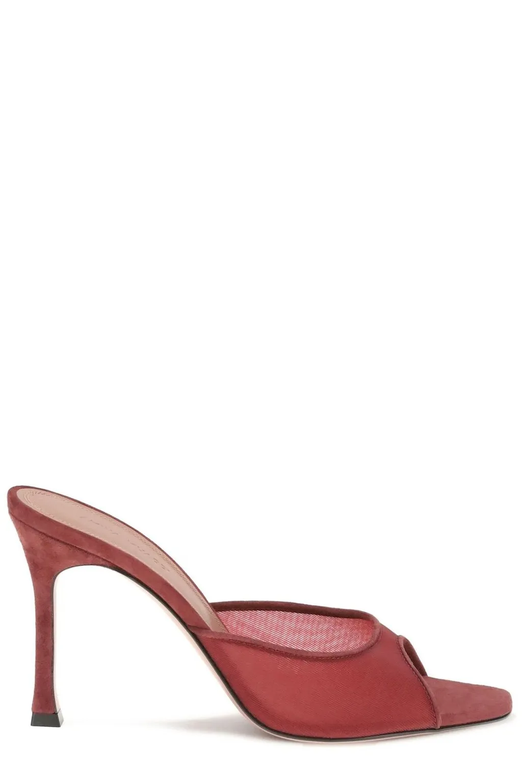 Calfskin leather and mesh slippers with a pointed toe and stiletto heel. Features a sheer mesh panel across the vamp.