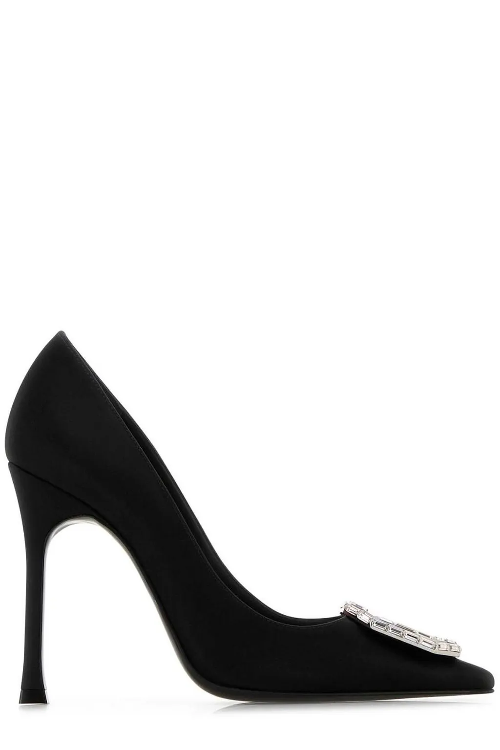 Fabric pumps in black with a pointed toe and embellished front. Features a stiletto heel.