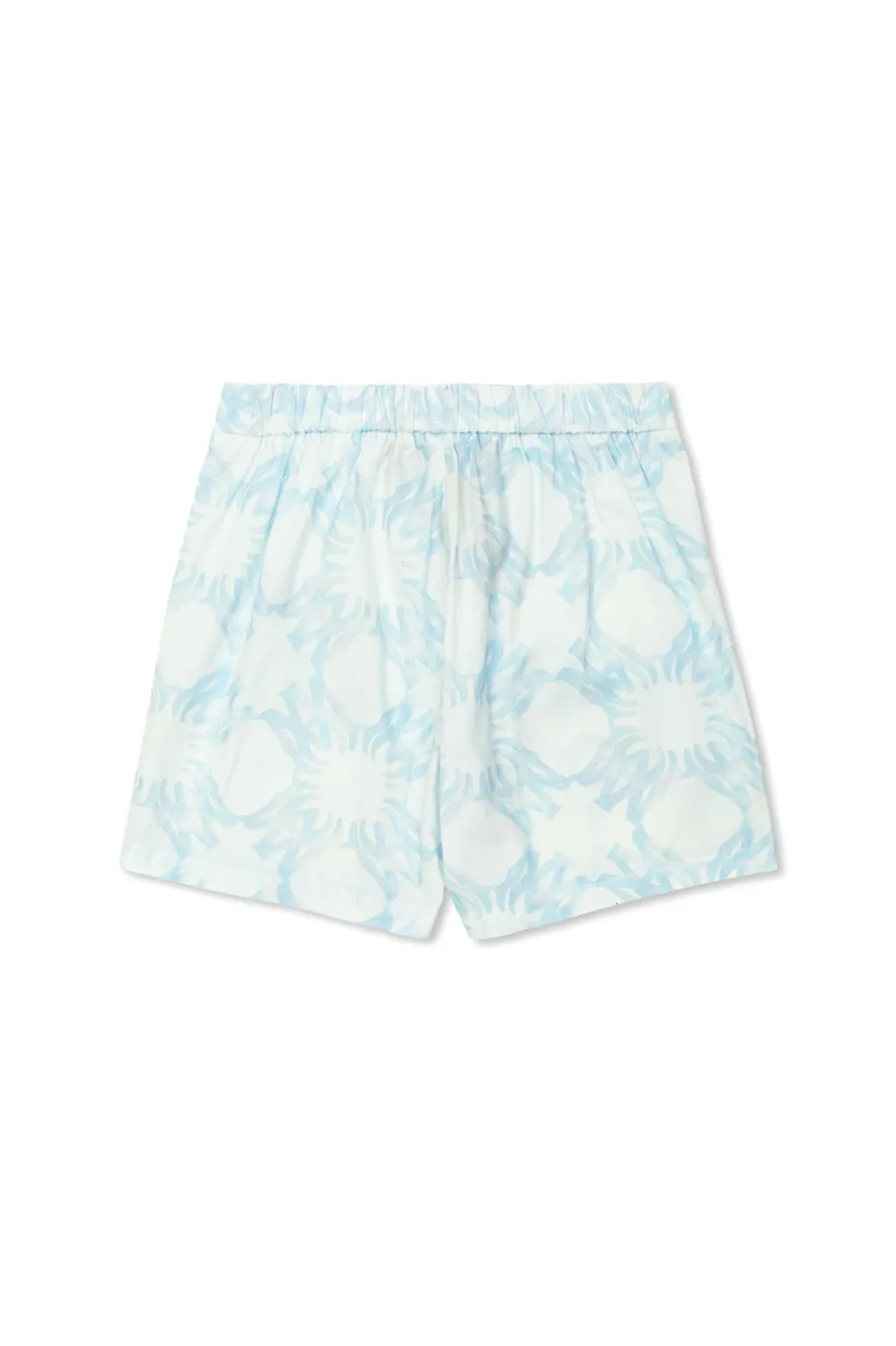 These shorts feature a white base with a repeating blue sunburst pattern. They have a relaxed fit with a comfortable elastic waistband.