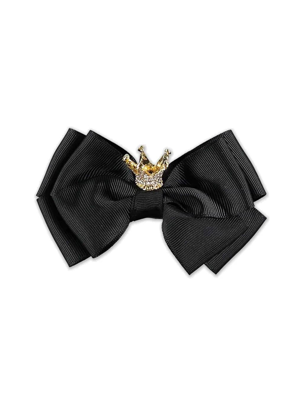 A black grosgrain ribbon bow hair clip adorned with a small gold-toned crown charm embellished with clear rhinestones.
