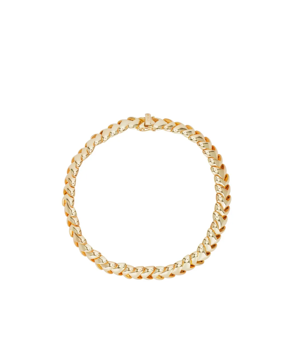 14k gold plated brass necklace with a layered heart shape link. The box button is closed.
