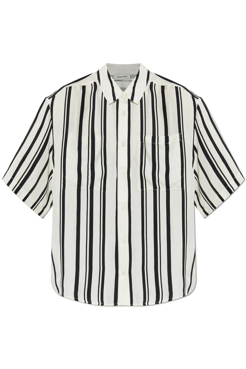 A cupro and viscose blend t-shirt in a striped pattern. It features a relaxed fit, short sleeves, and a button-down front with a chest pocket.