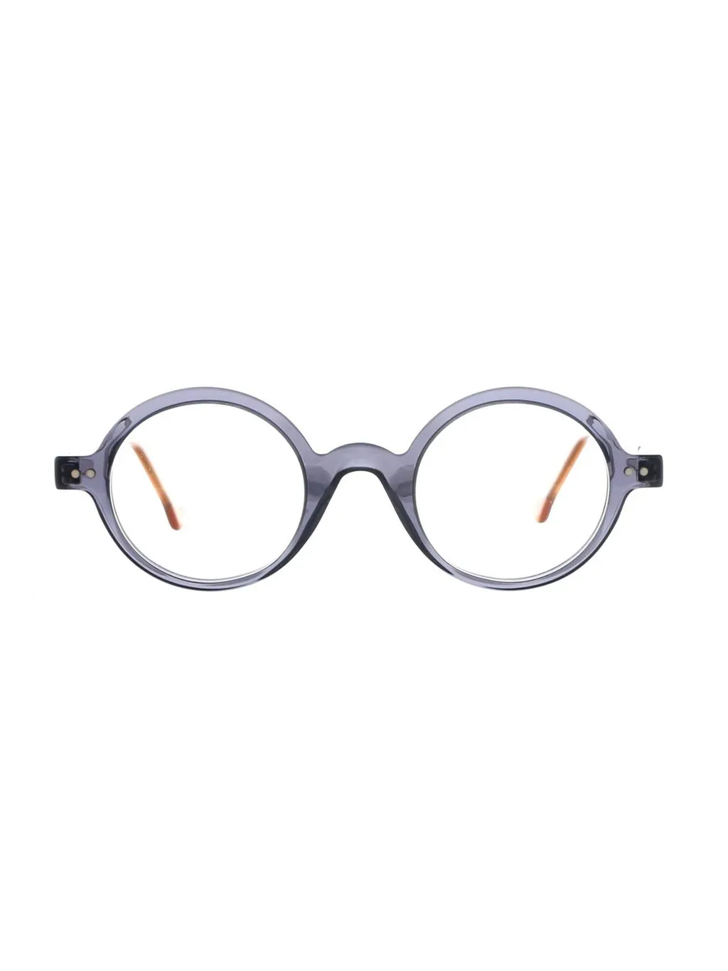 Round eyeglasses with a translucent grey acetate frame and brown temples. The frames feature a classic round shape with a double bridge. The temples are a contrasting brown color and have a subtle gradient effect. The lenses are clear.