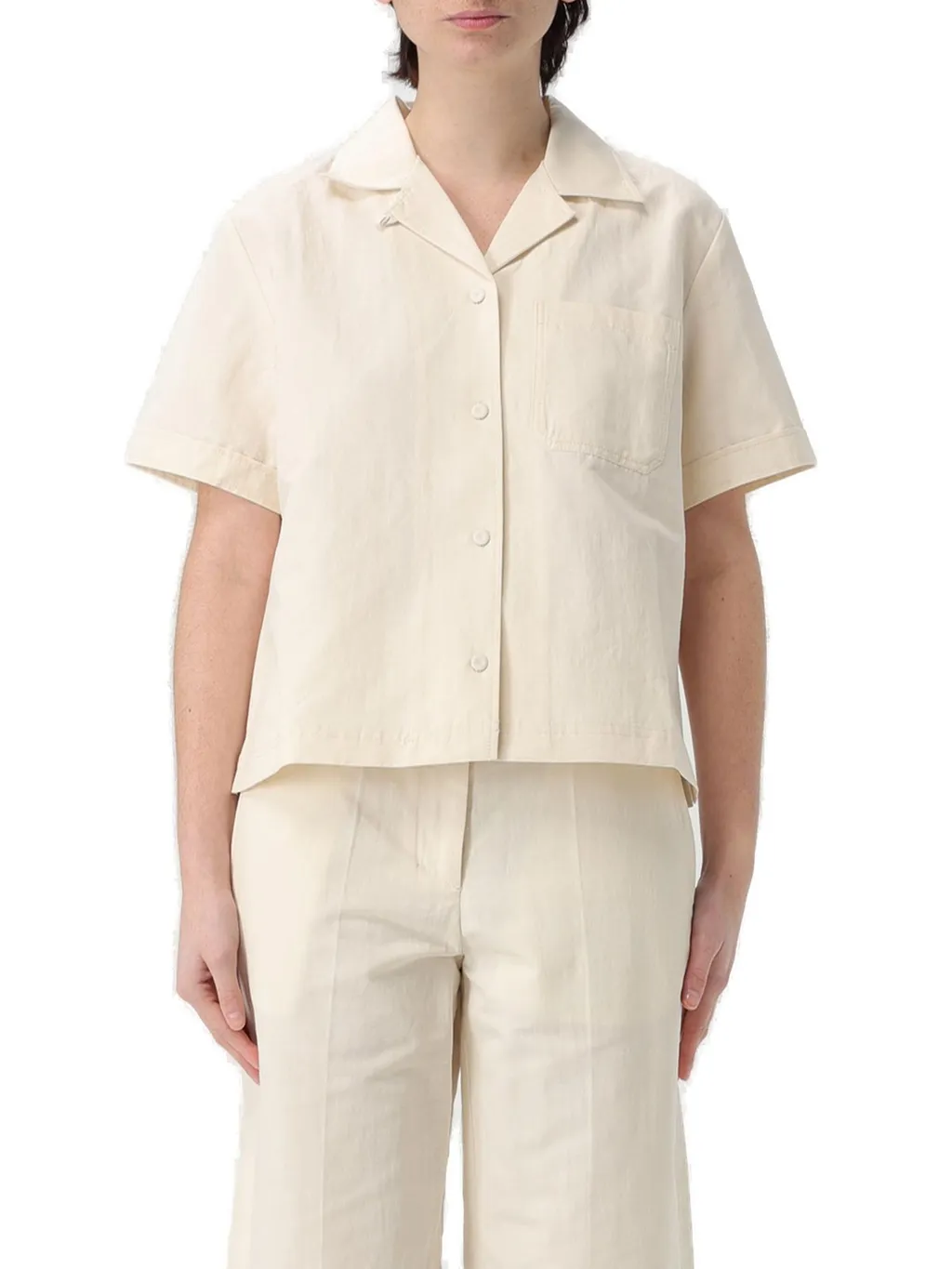A short-sleeved cuban collar shirt with a button-down front and a single chest pocket. The back features a pleat detail for added volume. The shirt has a relaxed fit and a cropped hem.