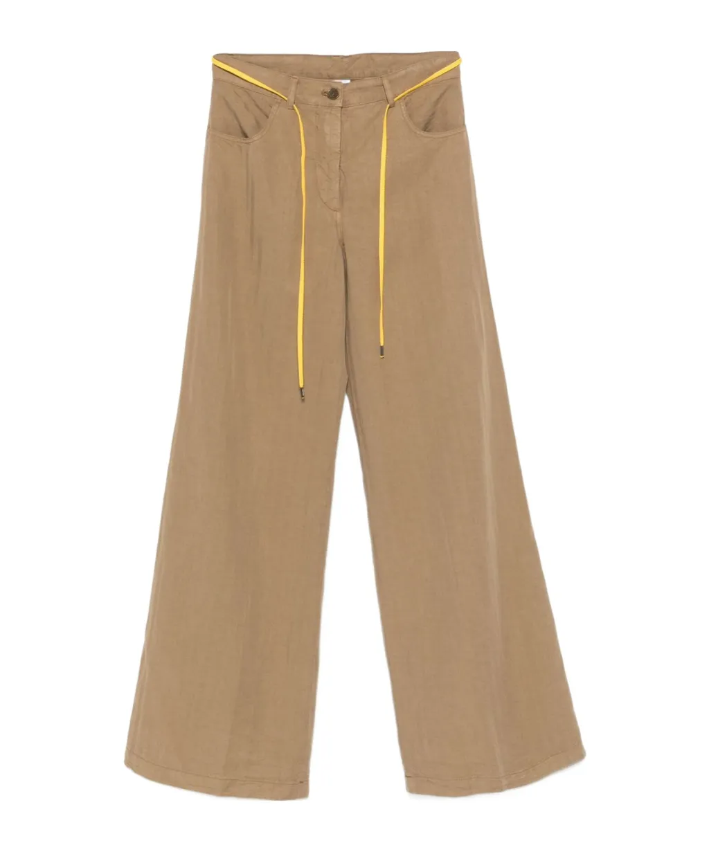 DescriptionTrousers with jean-style pockets on the front and patch pockets on the back. Features buckles on the waist, a zippered placket, and button opening and closing. Includes a yellow drawstring at the waist.
