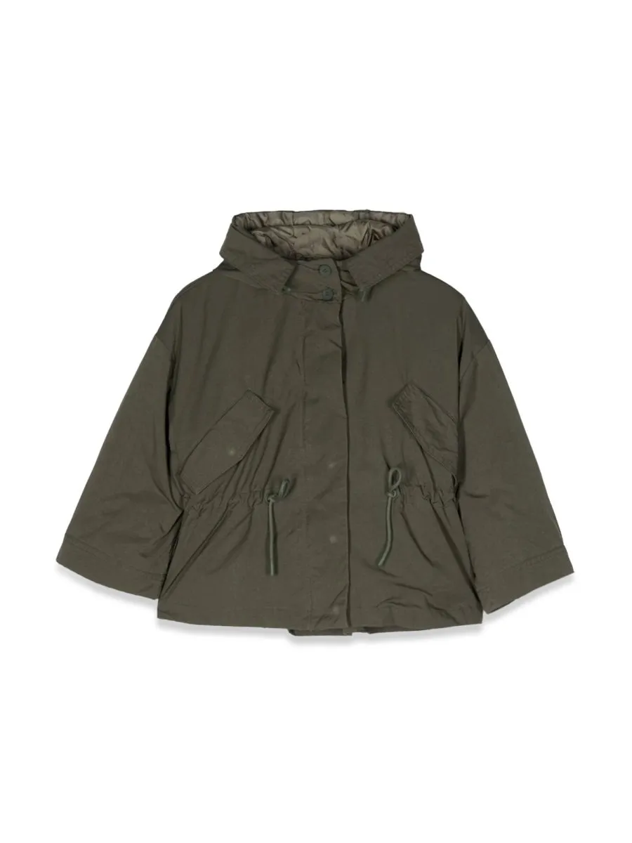A green parka with a drawstring waist and hood. It features a button-up front closure and two front pockets. The sleeves are wide and cropped.