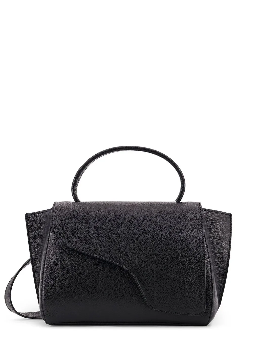 A black top-handle bag with a curved flap closure and a detachable shoulder strap. The bag features a single top handle and a structured silhouette.