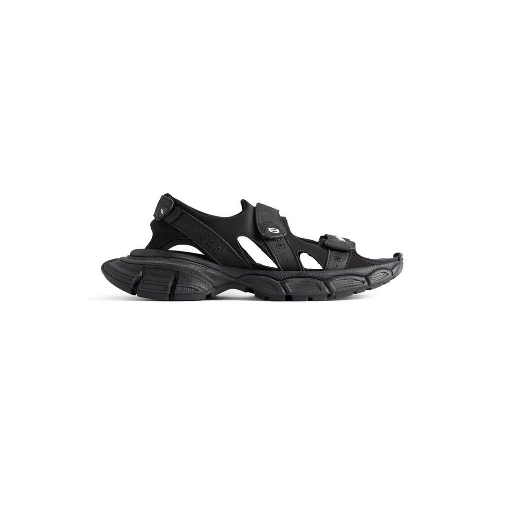 Leather-free sandal with three hook and loop straps. Features balenciaga rubber logo on the strap, unity sports icon rubber logo on the side, blncg logo printed on the upper, 3b sports icon artwork at the back, and embossed logo at the back. Made in china.