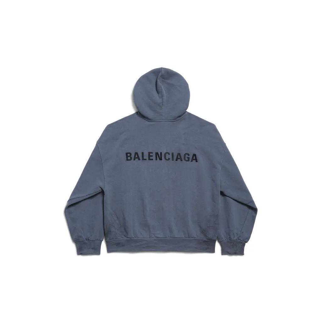 DescriptionA faded dark blue painted dry fleece zip-up hoodie for men. It features a hood without a drawstring, dropped shoulders, two front pockets, and gathered cuffs and waistline. "balenciaga back" embroidery is present on the front and back.