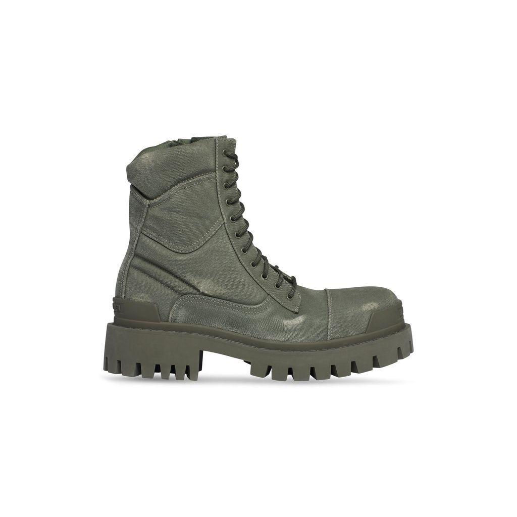 Lace-up boot with an extra round toe, washed and worn-out effect, and a 20mm arch. Features an inner zip, visible top-stitching, 11 eyelets on the vamp, and a thick toothed rubber outsole. Balenciaga logo is present on the front and back. Made in italy.