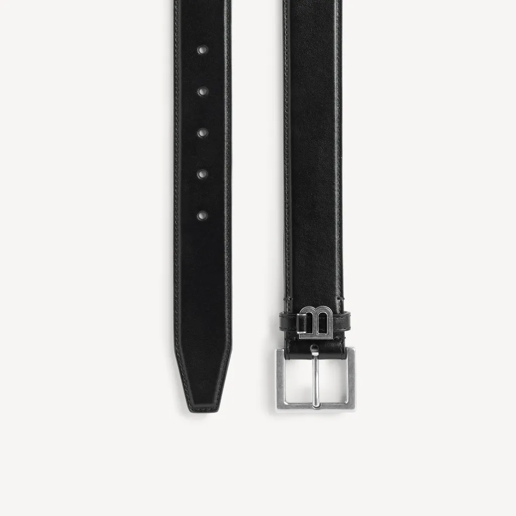 Black smooth calfskin belt with aged-silver hardware. Features 5 notches, a tone-on-tone leather loop with a metallic b logo, and balenciaga logo debossed at the end tip.