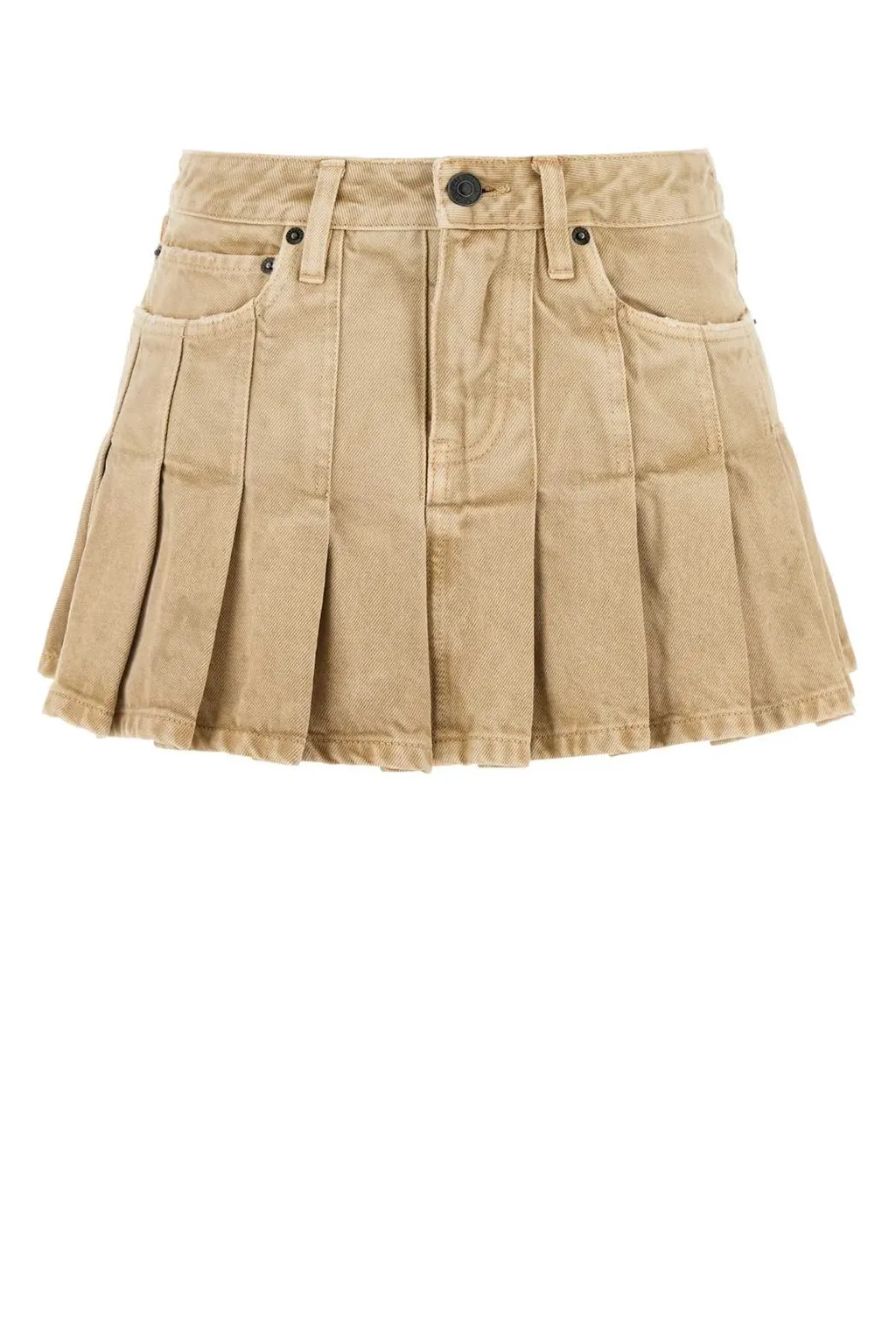 100% cotton. This skirt features a pleated design, a mini length, and a denim construction.