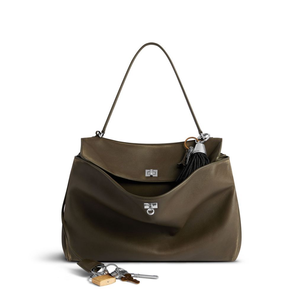 DescriptionThe rodeo handbag large in dark green used smooth calfskin features charms and aged-silver hardware. It is a handbag with one handle and a removable shoulder strap. It includes a removable cloche clés with two split rings, aged-silver hardware, and a turn lock closure. The exterior has a wide front pocket, and the interior features one main compartment, one inner zipped pocket, and two flat pockets at the back. Side snaps and four brass feet are present. The lining is made of nappa lambskin.