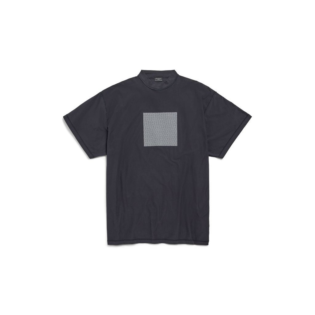 DescriptionText block inside-out t-shirt oversized in black and white vintage jersey is from look 72 of balenciaga summer 24 collection.. . This artwork features the words "if you're reading this, you're too close" in small type, without spaces or punctuation, repeated over and over in a square shape.