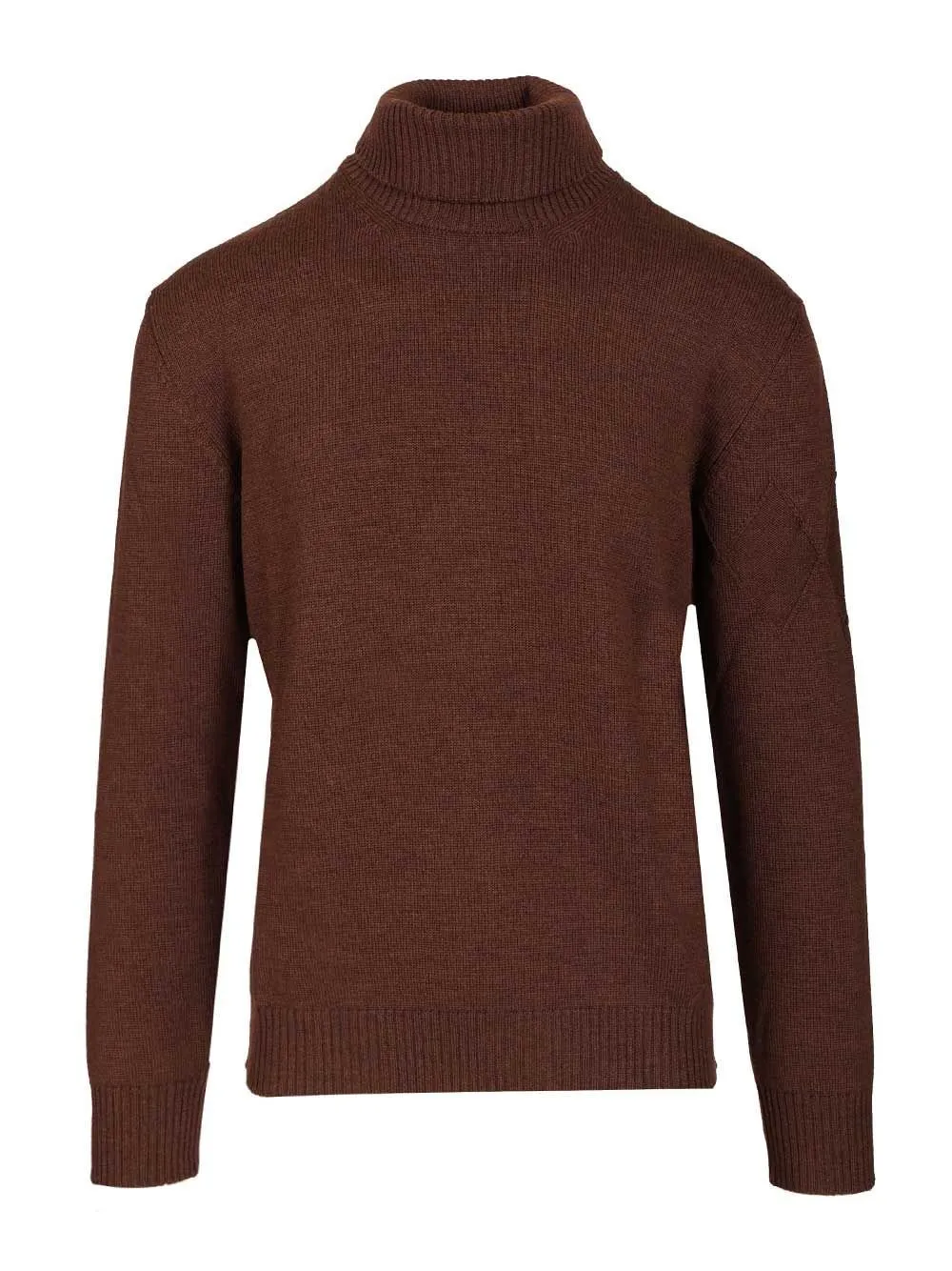 A classic brown turtleneck sweater with long sleeves and ribbed cuffs and hem. Features a subtle diamond-shaped detail on the left shoulder.