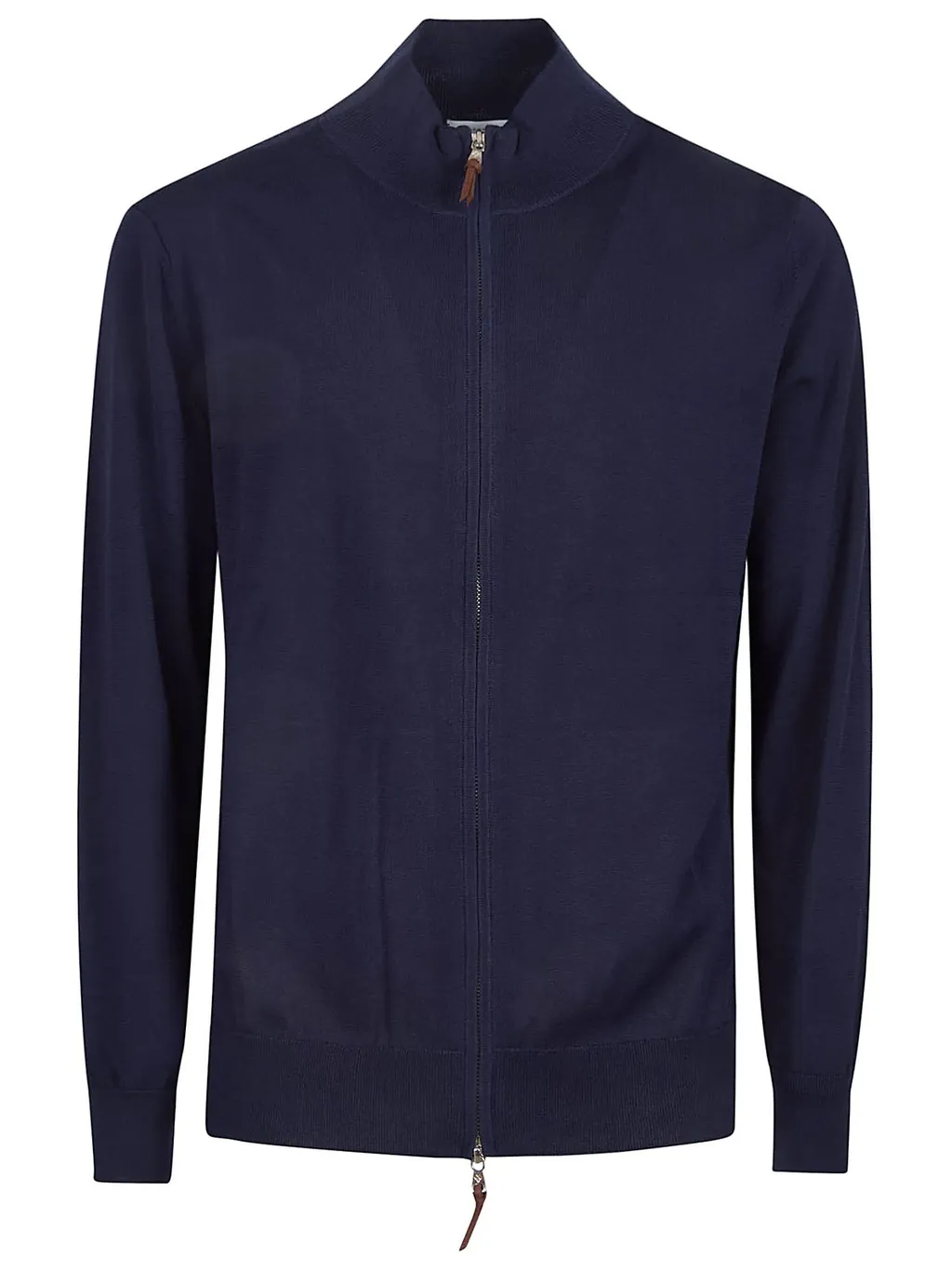 A navy blue zip-up cardigan with a stand-up collar and long sleeves. It features a full zip closure with a leather pull tab and ribbed cuffs and hem.
