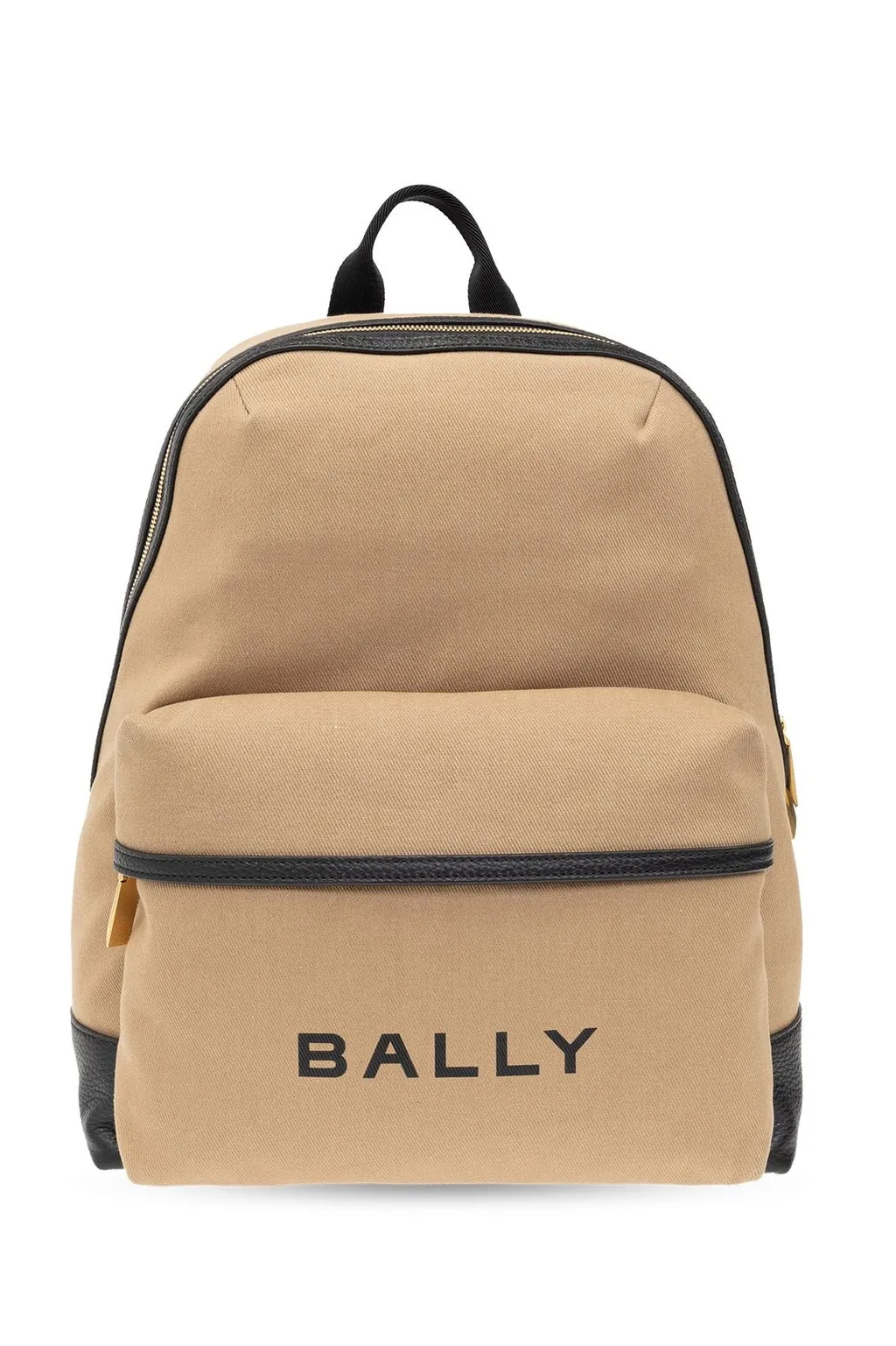 A beige canvas backpack with black leather trim and a front pocket. The backpack features a top handle, adjustable shoulder straps, and a zipper closure. The brand name 'bally' is printed in black on the front pocket.