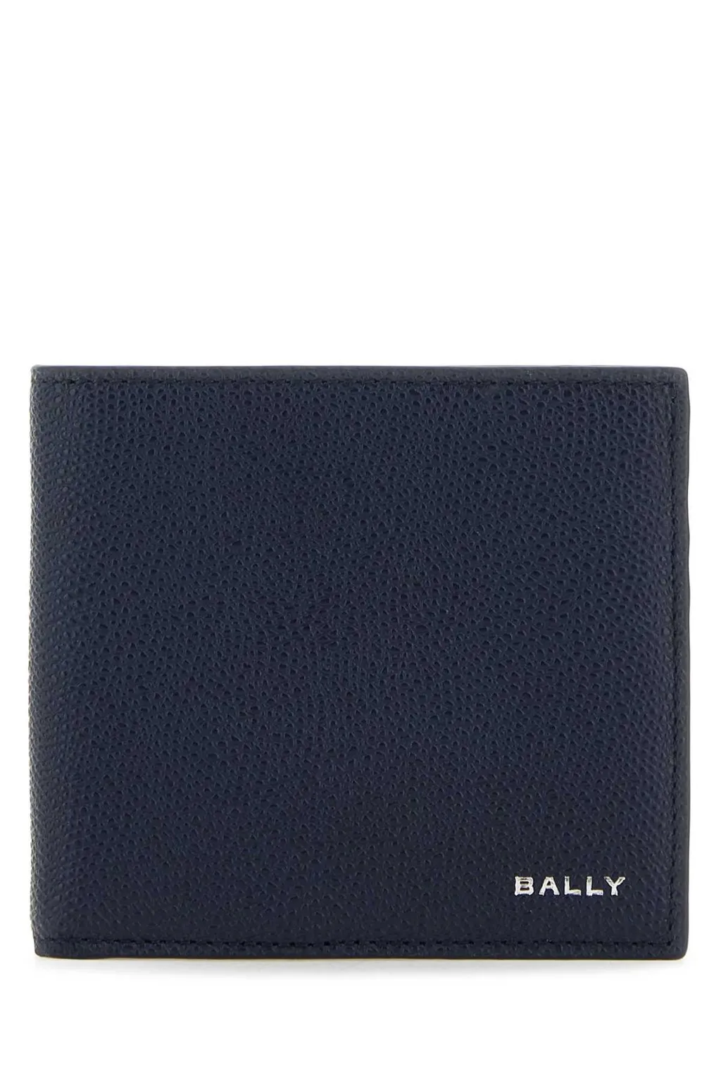 A navy blue bifold wallet with a textured finish and the bally logo embossed in silver on the front.