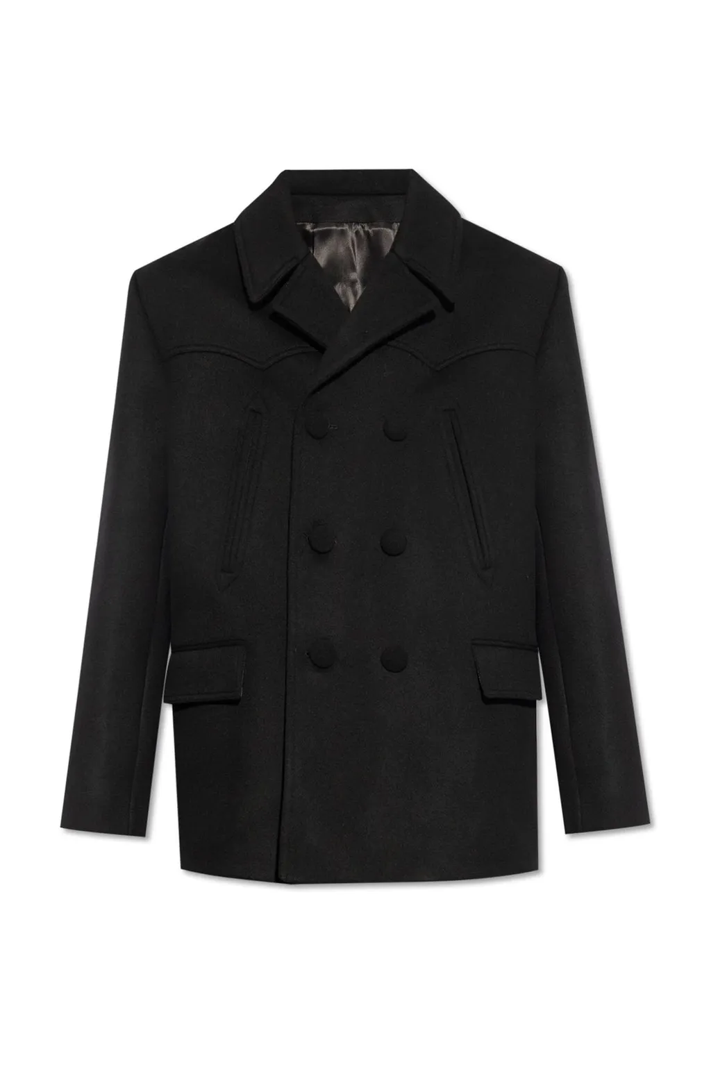 A double-breasted wool coat with a classic lapel, two front flap pockets, and button closure. The coat features western-inspired yoke detailing on the chest and back.