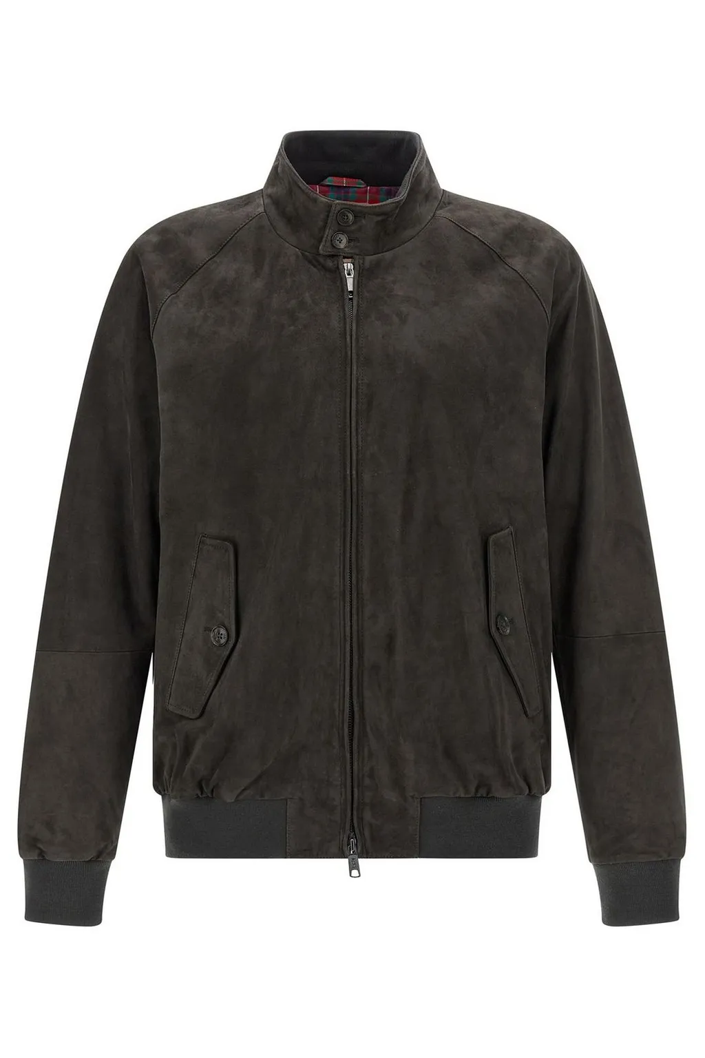 A men's bomber jacket in a dark brown suede. It features a stand-up collar with a button closure, a full zip front, and two flap pockets with button closures on the front. The jacket has elasticated cuffs and hem.