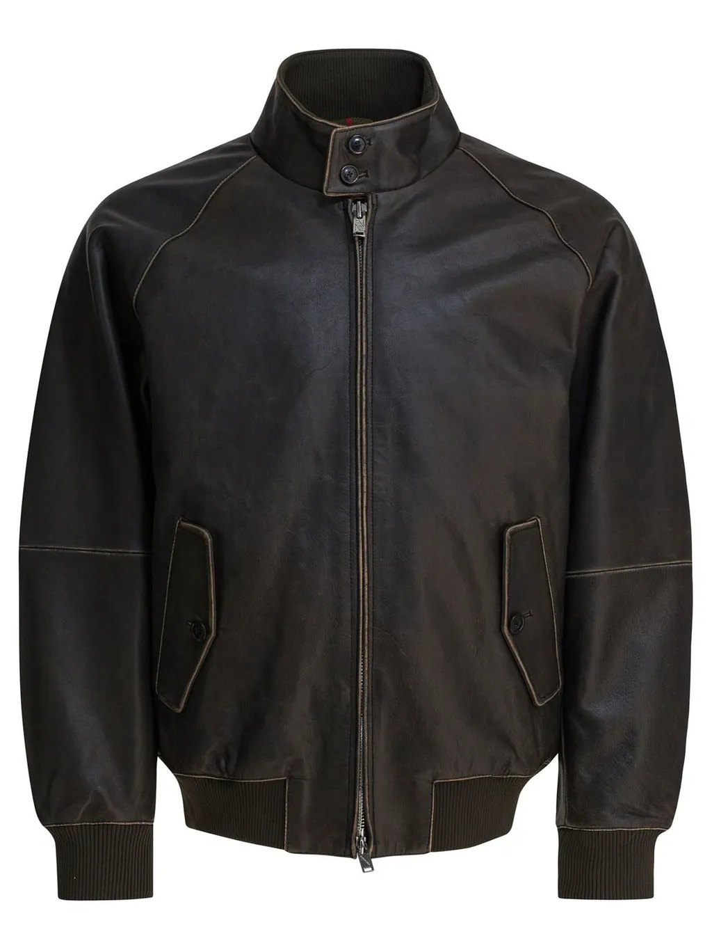 A brown leather bomber jacket with a stand-up collar, a zip-up front, and two flap pockets with button closures. The jacket features ribbed cuffs and hem, and contrast stitching details.