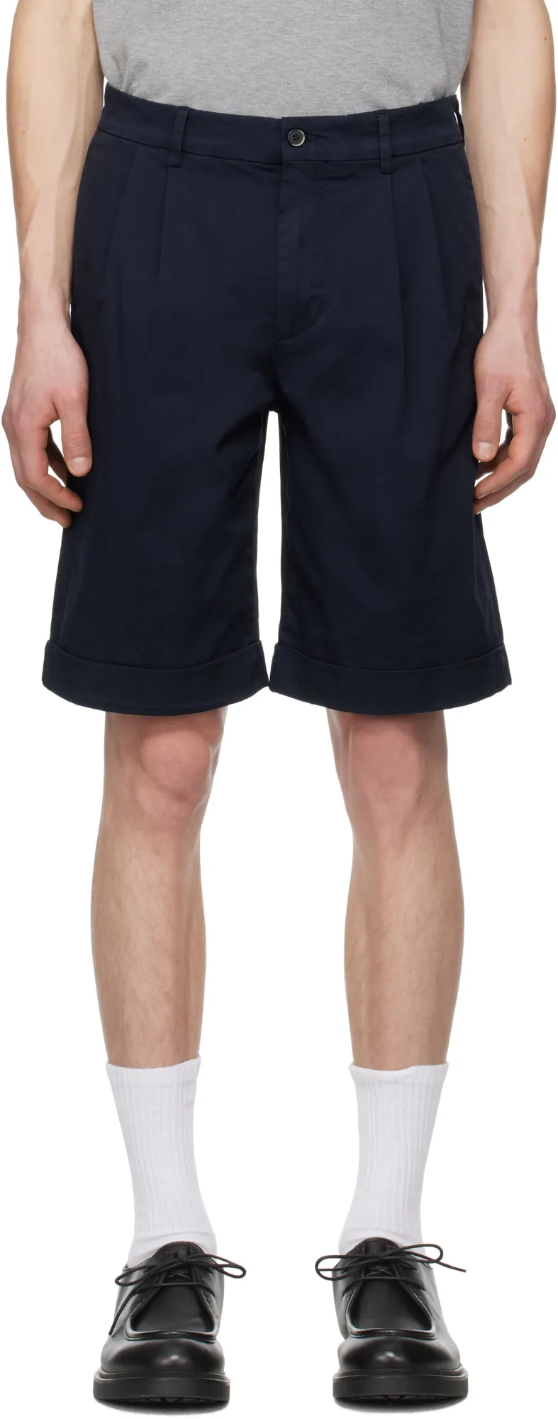 Mid-waist shorts with belt loops, four-pocket style, zipper placket, front pleats, and a trouser leg with a curled hem.