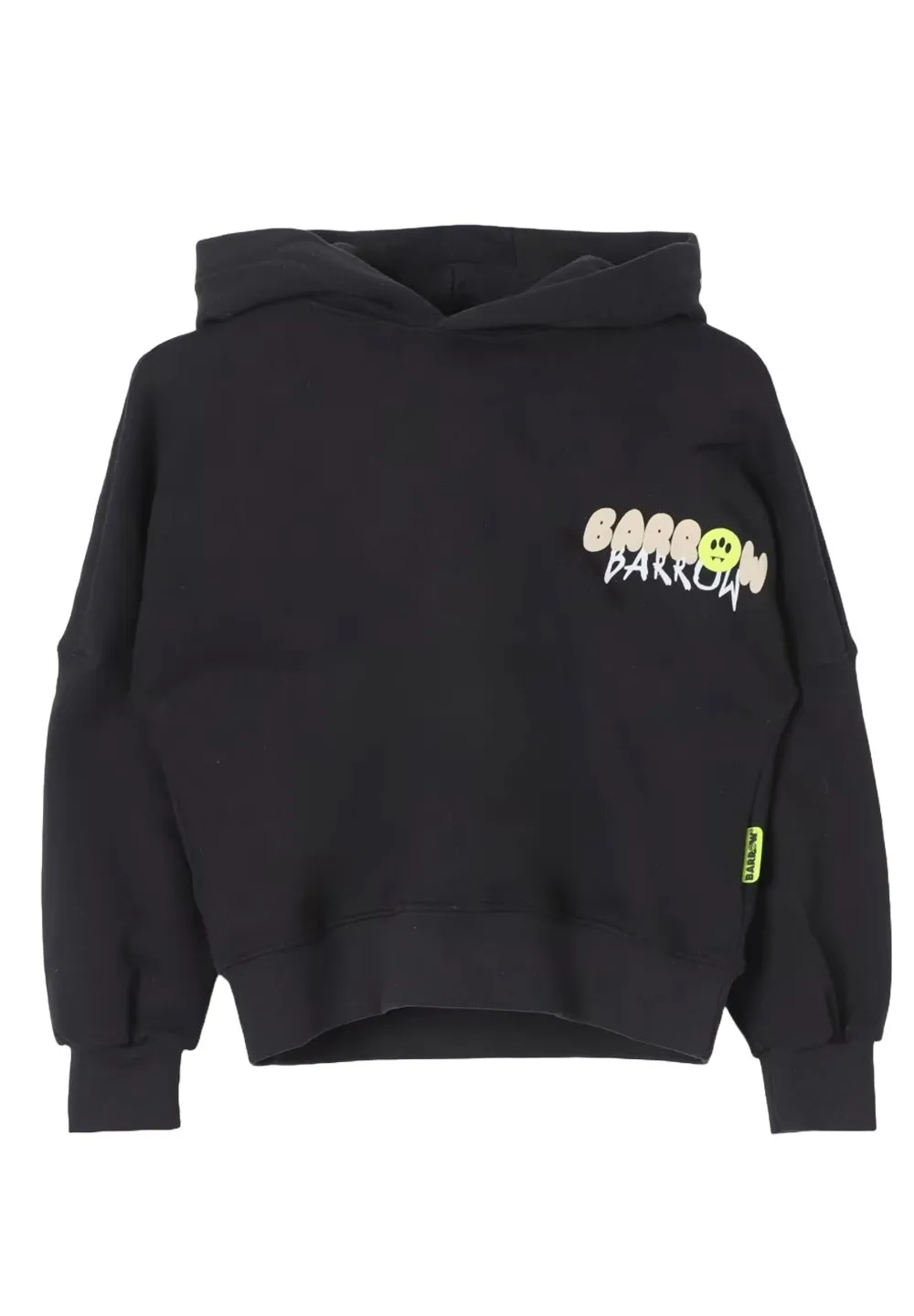 DescriptionBlack cotton hoodie with a drawstring hood, long sleeves, and a ribbed hem and cuffs. Features a graphic print on the front and back, including the brand name and various cartoon-style graphics like a smiley face and a heart.
