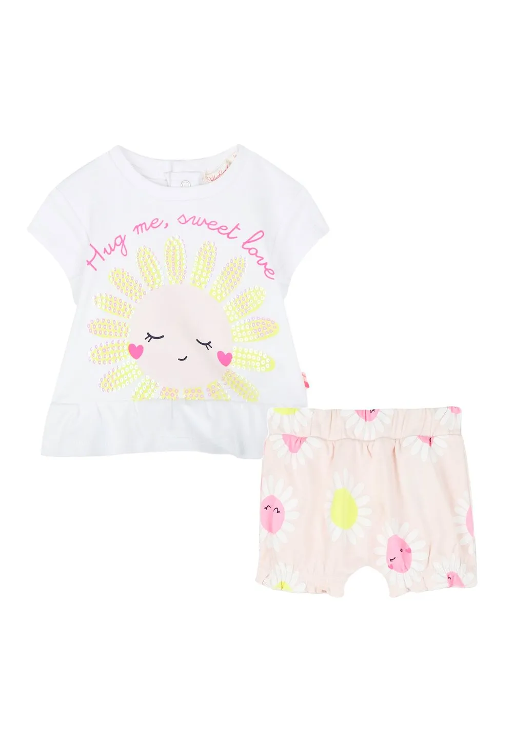 DescriptionA two-piece set for baby girls featuring a white t-shirt with a sequined sun graphic and the text 'hug me, sweet love'. The t-shirt has a ruffled hem. The set includes matching pink shorts with a print of daisies. Both pieces have an elastic waistband.