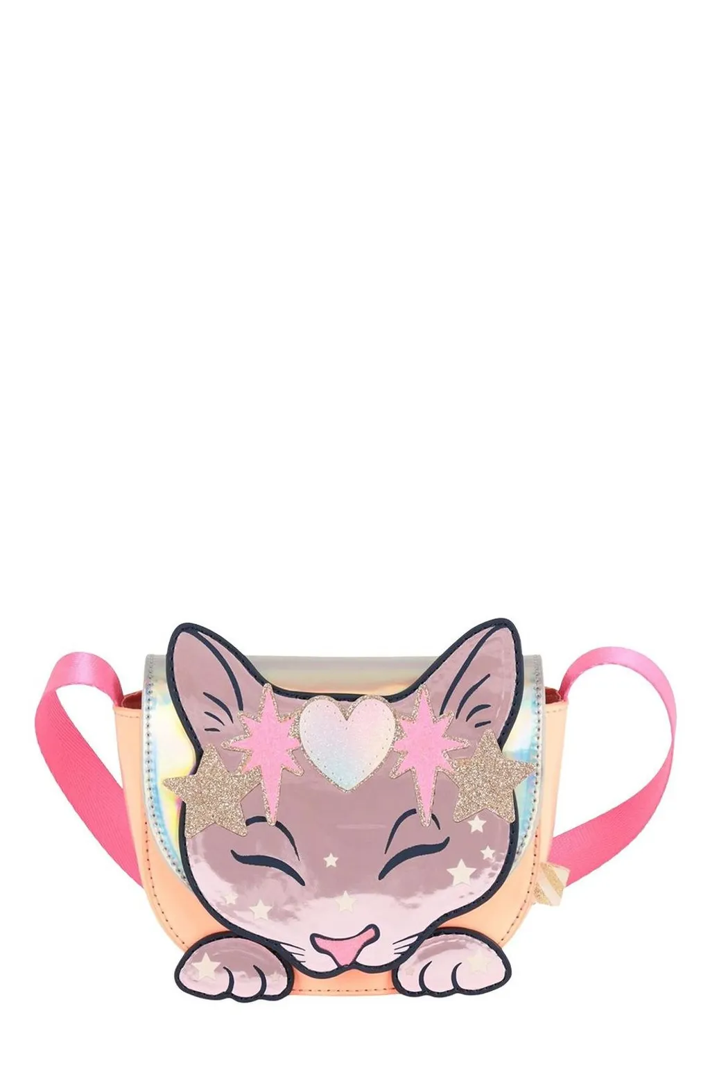 DescriptionA playful crossbody bag designed in the shape of a cat's face. It features holographic iridescent material with pink and gold star embellishments and a heart detail on the forehead. The bag has a main compartment with a flap closure and a pink adjustable strap.