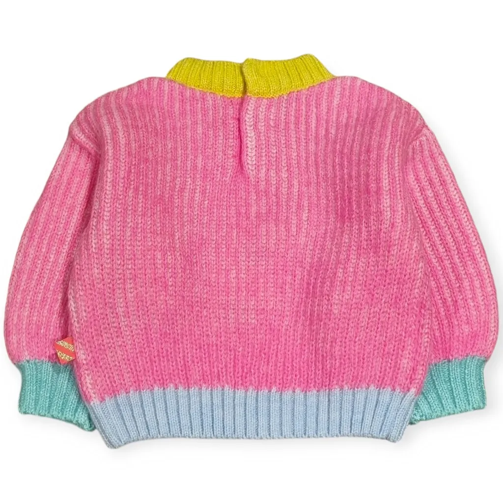 DescriptionA long-sleeved knit sweater for kids featuring a ribbed mock neck, cuffs, and hem. The main body is pink with subtle color variations. The cuffs are light blue, and the mock neck is bright yellow. A star-shaped appliqué with floral details and sequins is attached to the left chest. The sweater has a relaxed fit with balloon sleeves.