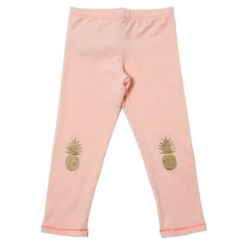 Pink leggings with a glittery pineapple graphic on each knee. The hem has a contrasting coral stitch detail.