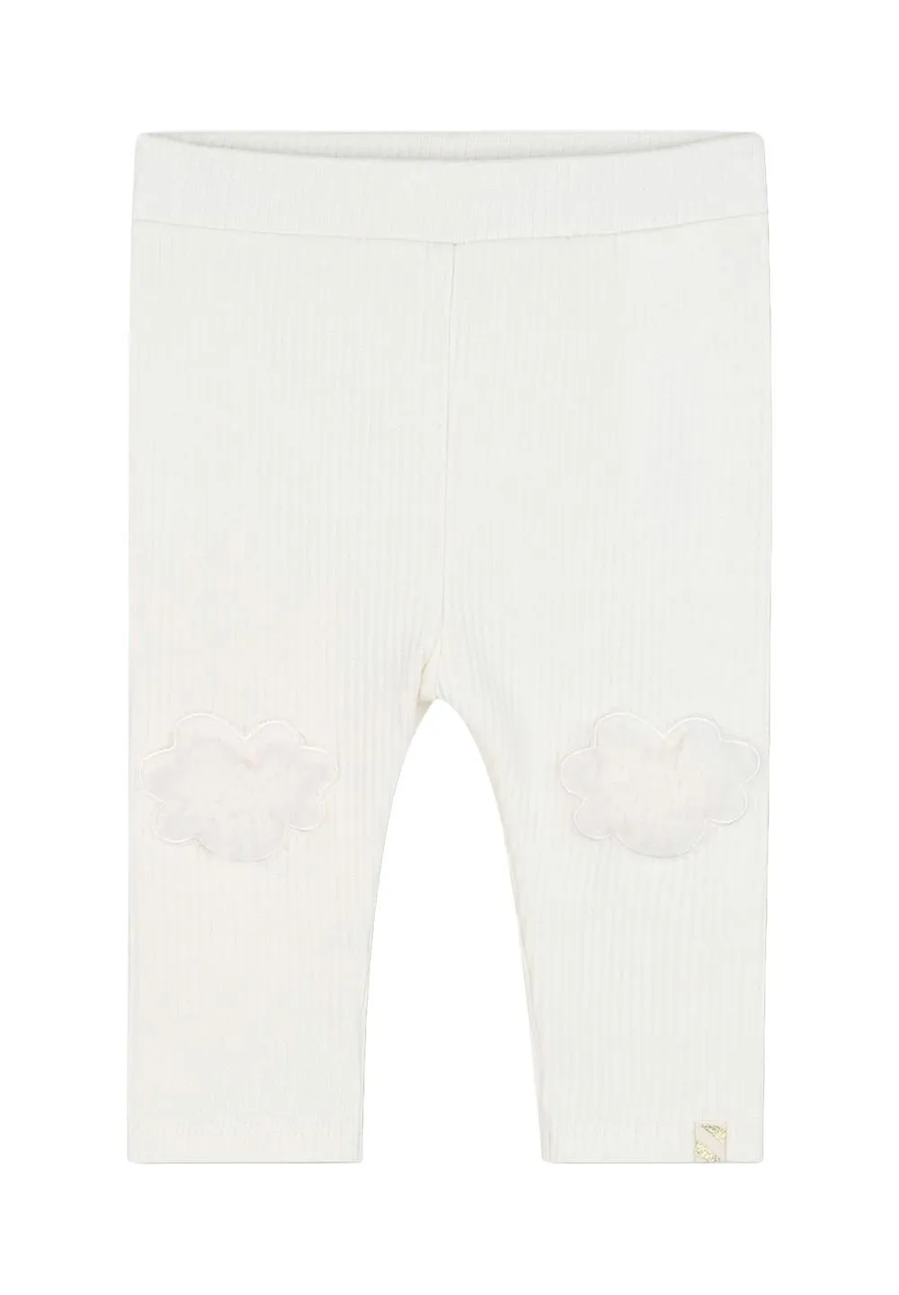 White ribbed leggings with a knee-length cut. Features two cloud-shaped appliqués on the knees. A small gold tag is present on the lower right leg.