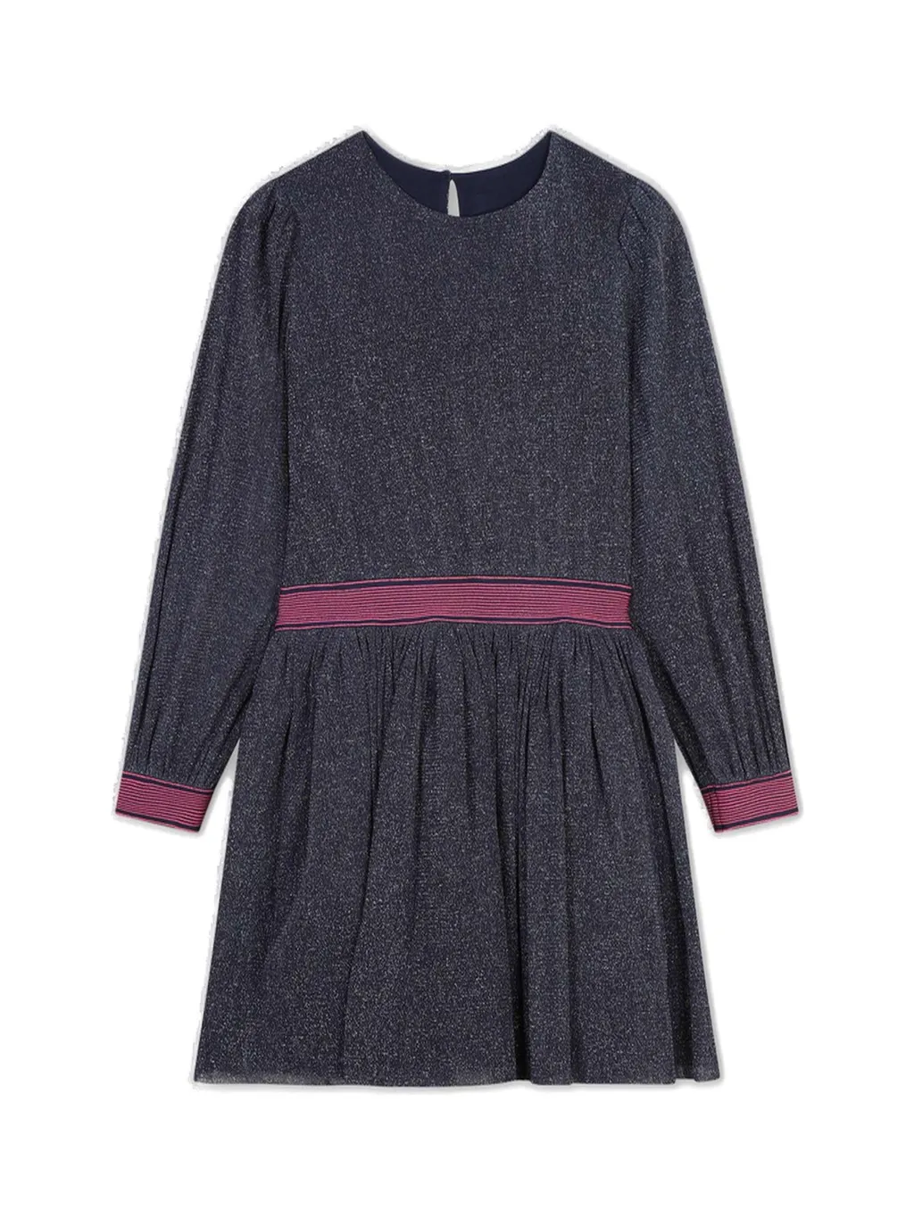 A long-sleeve dress with a sparkly fabric. It features a fitted bodice with a gathered skirt, a round neckline, and elasticated cuffs and waistband with a contrasting pink stripe.