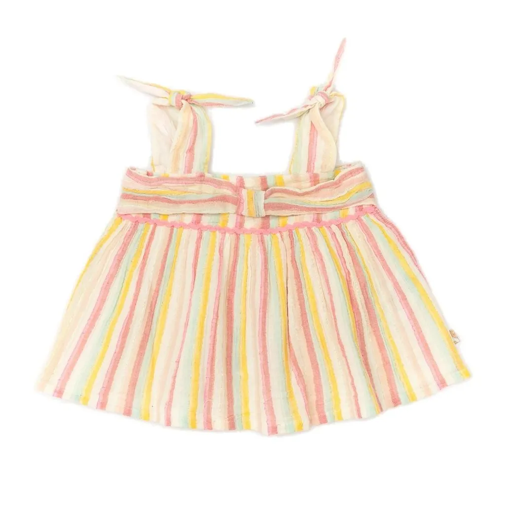 A sleeveless tank top for kids featuring a multicolored vertical stripe pattern. It has tie-shoulder straps and a smocked waistband for a comfortable fit. The hemline is slightly flared.