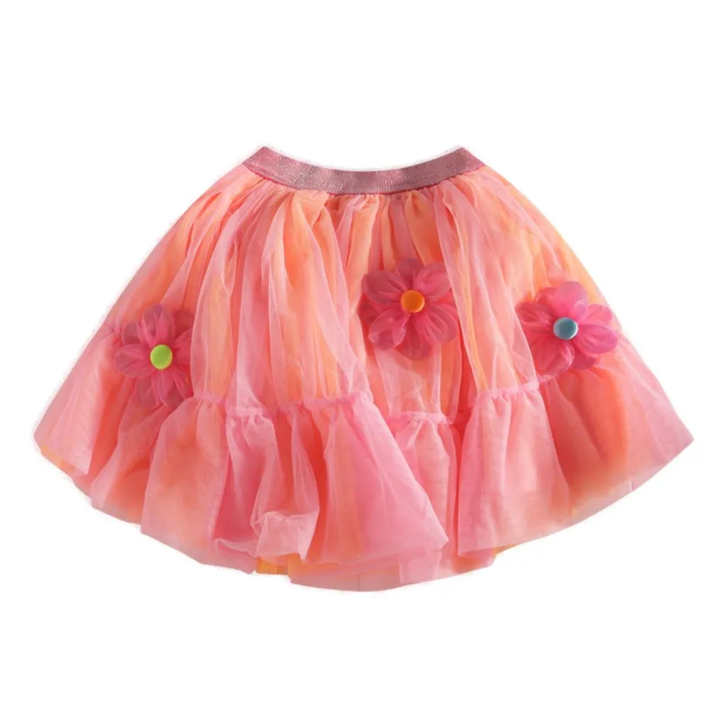 A tiered tulle skirt with a gradient of pink and orange. Features appliqué flowers with button centers scattered across the front. Elasticated waistband with a subtle glitter detail.